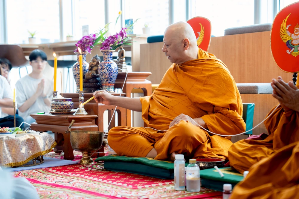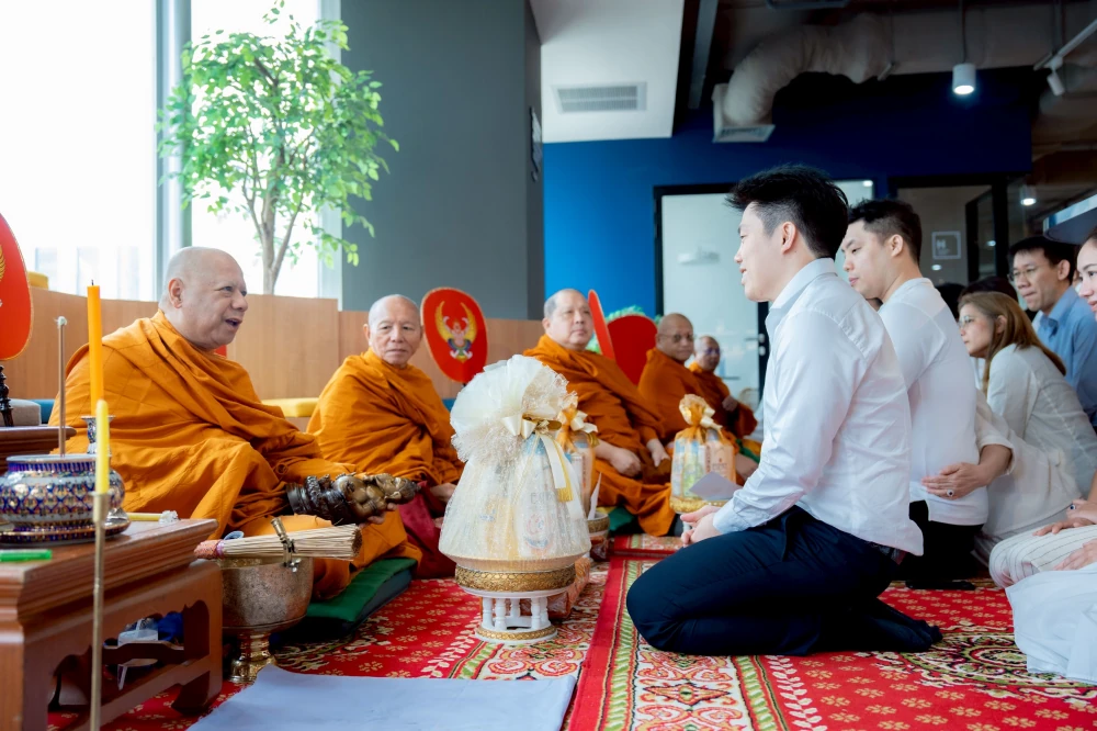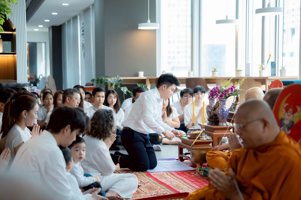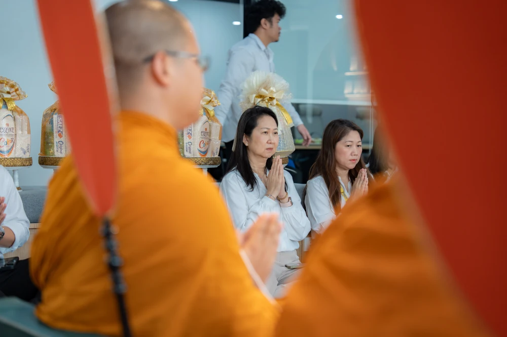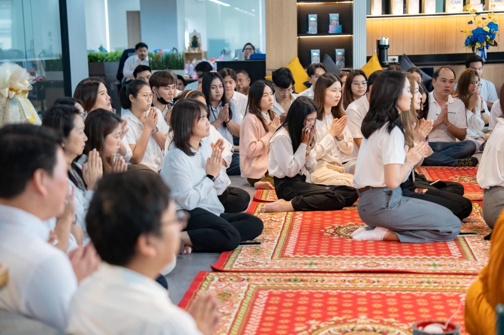 พิธีเริ่มต้นด้วยพิธีการสวดเจริญพระพุทธมนต์ หลังจากนั้นถวายภัตตาหารเพลพร้อมทั้งสังฆทานและจตุปัจจัยแด่พระอาจารย์วราห์ ปุญญวโร วัดโพธิ์ทอง พร้อมพระสงฆ์รวม 9 รูป เพื่อความเป็นสิริมงคล เสริมสร้างความเจริญรุ่งเรืองแก่พนักงานและองค์กร