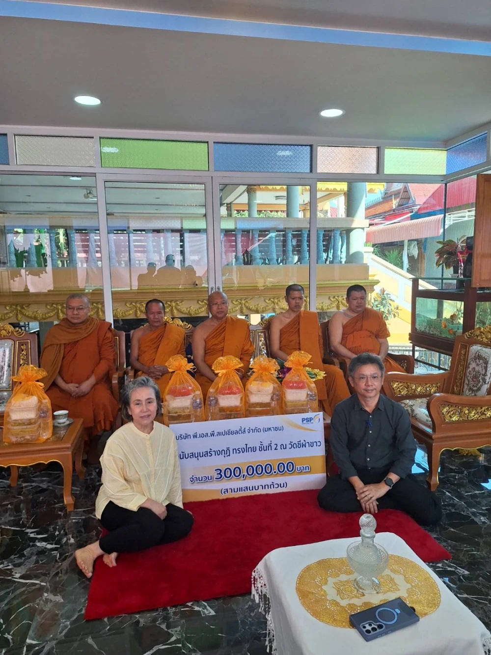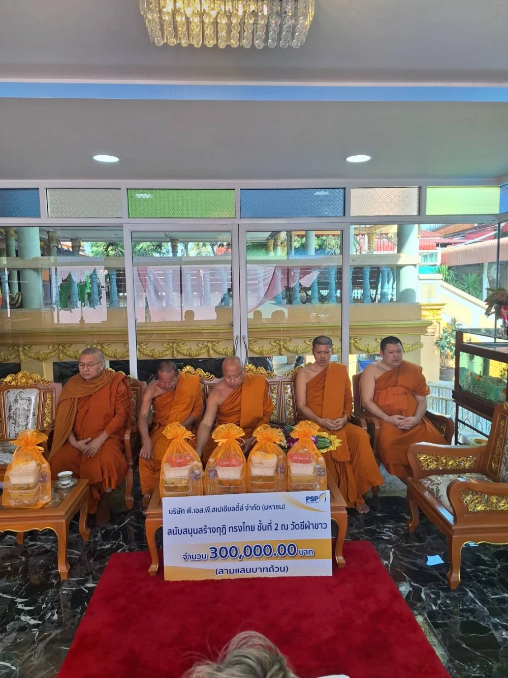 วันที่ 28 มกราคม 2569 ที่ผ่านมา บริษัท พี.เอส.พี. สเปเชียลตี้ส์ จำกัด (มหาชน) นำโดย คุณอุไรลักษณ์ ครองพาณิชย์ ผู้ช่วยประธานเจ้าหน้าที่สายการเงิน และคุณณรงค์ศักดิ์ เย็นสกุล ประธานเจ้าหน้าที่สายงานปฏิบัติการ ได้มอบเงินสนับสนุนมูลค่ากว่า 300,000 บาท เพื่อร่วมสนับสนุนการก่อสร้างกุฏิทรงไทย ชั้นที่2 ณ วัดชีผ้าขาว จังหวัดสมุทรสาคร